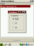 Wenn Sie dann auf die gewünschte Datei tippen, startet die Installationsroutine. Tippen Sie auf Installieren und es erscheint (sofern Sie zusätzliche Speicherkarten eingesteckt haben) das nebenstehende Bild. Wählen Sie hier den gewünschten Speicherort und tippen auf OK. Darauf kommt kurz die Meldung "wird installiert" und das Fenster Pakete installieren wird aktualisiert.Sie können jetzt das Installationsprogramm beenden. Wenn Sie wollen, können Sie jetzt auch die .ipk -Datei aus dem Dokumentordner löschen und somit Speicherplatz freigeben, denn die Anwendung ist ja fertig installiert. |